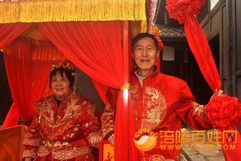 (夏斐然)重庆两汇旅行社有限公司于今天(2026年1月16日)上午,组织4对金婚、银婚老人,彩排走秀涪陵千年古镇蔺市,抬轿、进乡情馆、雷家大院拜堂、揭红盖......回忆50年、40年夫妻美好的幸福生活。