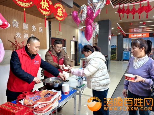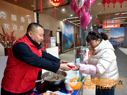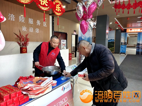 活动现场暖意盎然、氛围热烈,志愿者们热情接待每一位过往旅客,细致周到地送上各类关怀。热气腾腾的涪陵当地特色美食油醪糟汤圆、驱寒暖胃的红糖姜茶,驱散了旅客旅途的疲惫与寒意;新春对联、精美新春挂件等,为旅客送上浓浓的新春祝福。同时,志愿者们主动为过往旅客提供精准路线指引,耐心推荐涪陵周边特色景点,助力旅客合理规划行程,让旅途更具乐趣。